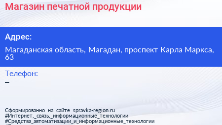 Магазин печатной продукции по адресу Магаданская область, Магадан, проспект Карла Маркса, 63 в дальнейшем Организация, размещена в следующих категориях: