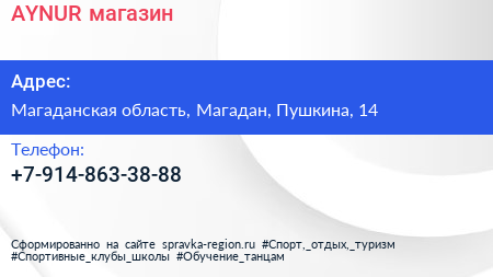 AYNUR, магазин по адресу Магаданская область, Магадан, Пушкина, 14 в дальнейшем Организация, размещена в следующих категориях: