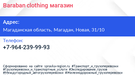 Baraban clothing, магазин по адресу Магаданская область, Магадан, Новая, 31/10 в дальнейшем Организация, размещена в следующих категориях: