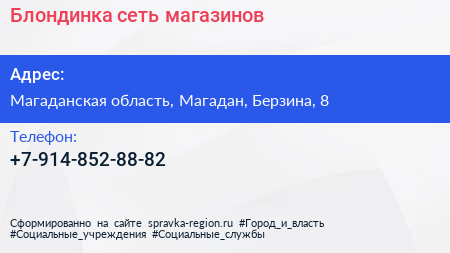 Блондинка, сеть магазинов по адресу Магаданская область, Магадан, Берзина, 8 в дальнейшем Организация, размещена в следующих категориях: