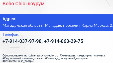 Boho Chic, шоурум по адресу Магаданская область, Магадан, проспект Карла Маркса, 27 в дальнейшем Организация, размещена в следующих категориях: