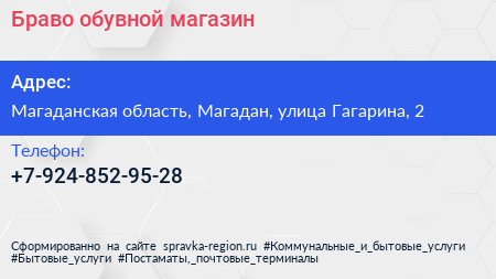 Браво, обувной магазин по адресу Магаданская область, Магадан, улица Гагарина, 2 в дальнейшем Организация, размещена в следующих категориях: