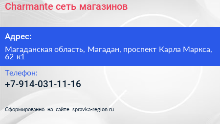 Charmante, сеть магазинов по адресу Магаданская область, Магадан, проспект Карла Маркса, 62 к1 в дальнейшем Организация, размещена в следующих категориях: