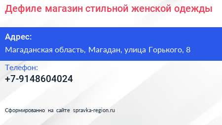 Дефиле, магазин стильной женской одежды по адресу Магаданская область, Магадан, улица Горького, 8 в дальнейшем Организация, размещена в следующих категориях: