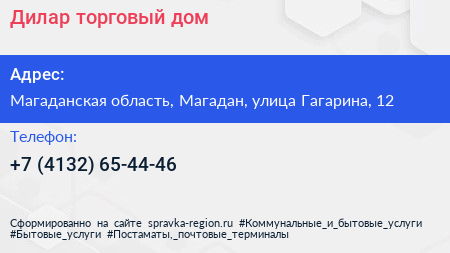 Дилар, торговый дом по адресу Магаданская область, Магадан, улица Гагарина, 12 в дальнейшем Организация, размещена в следующих категориях: