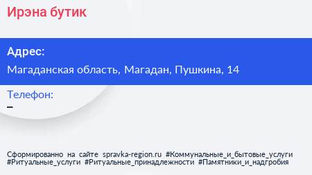 Ирэна, бутик по адресу Магаданская область, Магадан, Пушкина, 14 в дальнейшем Организация, размещена в следующих категориях: