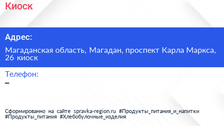 Киоск по адресу Магаданская область, Магадан, проспект Карла Маркса, 26 киоск в дальнейшем Организация, размещена в следующих категориях: