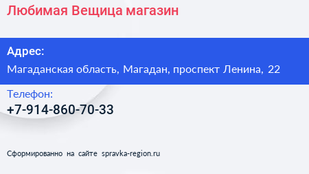 Любимая Вещица, магазин по адресу Магаданская область, Магадан, проспект Ленина, 22 в дальнейшем Организация, размещена в следующих категориях: