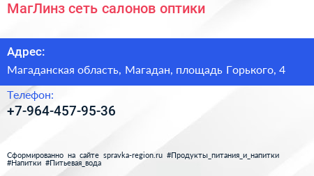 МагЛинз, сеть салонов оптики по адресу Магаданская область, Магадан, площадь Горького, 4 в дальнейшем Организация, размещена в следующих категориях: