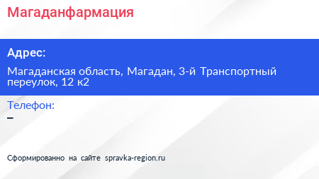 Магаданфармация по адресу Магаданская область, Магадан, 3-й Транспортный переулок, 12 к2 в дальнейшем Организация, размещена в следующих категориях:
