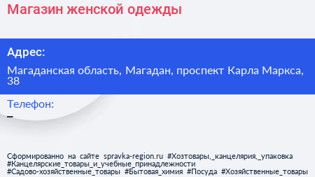 Магазин женской одежды по адресу Магаданская область, Магадан, проспект Карла Маркса, 38 в дальнейшем Организация, размещена в следующих категориях: