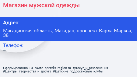 Магазин мужской одежды по адресу Магаданская область, Магадан, проспект Карла Маркса, 38 в дальнейшем Организация, размещена в следующих категориях: