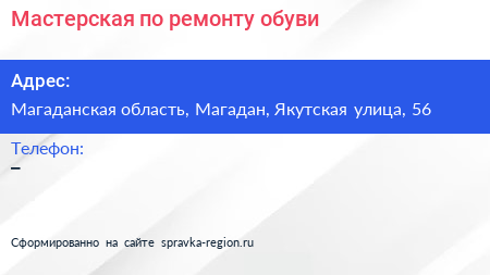 Мастерская по ремонту обуви по адресу Магаданская область, Магадан, Якутская улица, 56 в дальнейшем Организация, размещена в следующих категориях: