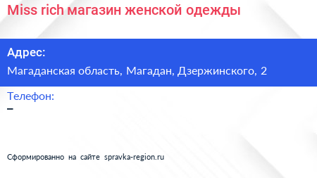 Miss rich, магазин женской одежды по адресу Магаданская область, Магадан, Дзержинского, 2 в дальнейшем Организация, размещена в следующих категориях: