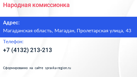 Народная комиссионка по адресу Магаданская область, Магадан, Пролетарская улица, 43 в дальнейшем Организация, размещена в следующих категориях: