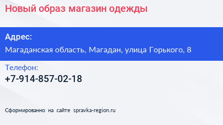 Новый образ, магазин одежды по адресу Магаданская область, Магадан, улица Горького, 8 в дальнейшем Организация, размещена в следующих категориях:
