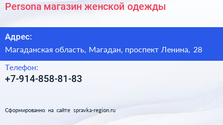 Persona, магазин женской одежды по адресу Магаданская область, Магадан, проспект Ленина, 28 в дальнейшем Организация, размещена в следующих категориях: