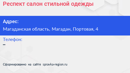 Респект, салон стильной одежды по адресу Магаданская область, Магадан, Портовая, 4 в дальнейшем Организация, размещена в следующих категориях: