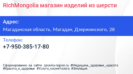 RichMongolia, магазин изделий из шерсти по адресу Магаданская область, Магадан, Дзержинского, 28 в дальнейшем Организация, размещена в следующих категориях: