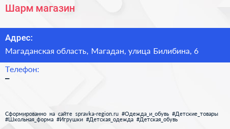 Шарм, магазин по адресу Магаданская область, Магадан, улица Билибина, 6 в дальнейшем Организация, размещена в следующих категориях: