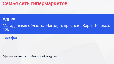 Семья, сеть гипермаркетов по адресу Магаданская область, Магадан, проспект Карла Маркса, 49Б в дальнейшем Организация, размещена в следующих категориях: