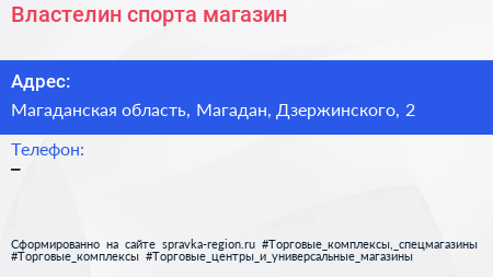 Властелин спорта, магазин по адресу Магаданская область, Магадан, Дзержинского, 2 в дальнейшем Организация, размещена в следующих категориях: