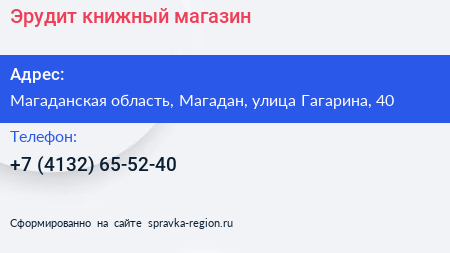 Эрудит, книжный магазин по адресу Магаданская область, Магадан, улица Гагарина, 40 в дальнейшем Организация, размещена в следующих категориях: