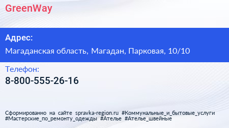 GreenWay по адресу Магаданская область, Магадан, Парковая, 10/10 в дальнейшем Организация, размещена в следующих категориях: