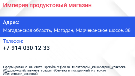 Империя, продуктовый магазин по адресу Магаданская область, Магадан, Марчеканское шоссе, 38 в дальнейшем Организация, размещена в следующих категориях:
