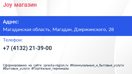 Joy, магазин по адресу Магаданская область, Магадан, Дзержинского, 28 в дальнейшем Организация, размещена в следующих категориях: