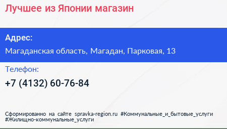 Лучшее из Японии, магазин по адресу Магаданская область, Магадан, Парковая, 13 в дальнейшем Организация, размещена в следующих категориях: