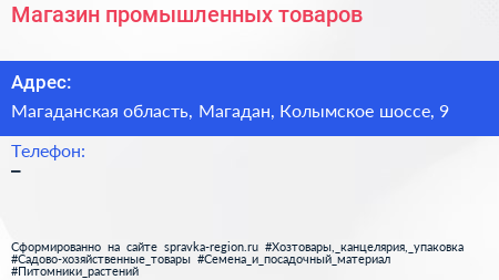 Магазин промышленных товаров по адресу Магаданская область, Магадан, Колымское шоссе, 9 в дальнейшем Организация, размещена в следующих категориях: