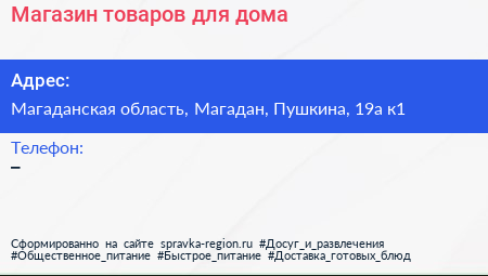 Магазин товаров для дома по адресу Магаданская область, Магадан, Пушкина, 19а к1 в дальнейшем Организация, размещена в следующих категориях: