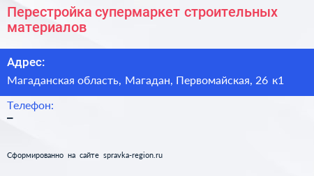 Перестройка, супермаркет строительных материалов по адресу Магаданская область, Магадан, Первомайская, 26 к1 в дальнейшем Организация, размещена в следующих категориях: