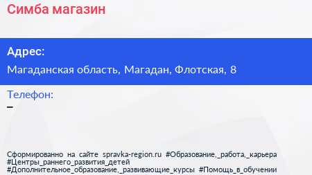 Симба, магазин по адресу Магаданская область, Магадан, Флотская, 8 в дальнейшем Организация, размещена в следующих категориях: