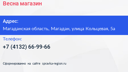 Весна, магазин по адресу Магаданская область, Магадан, улица Кольцевая, 5а в дальнейшем Организация, размещена в следующих категориях: