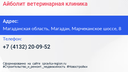 Айболит, ветеринарная клиника по адресу Магаданская область, Магадан, Марчеканское шоссе, 8 в дальнейшем Организация, размещена в следующих категориях: