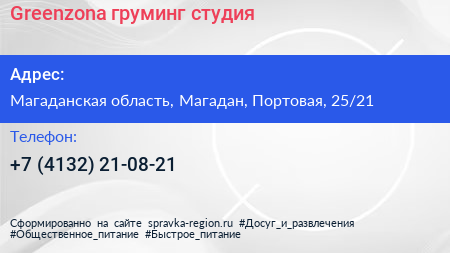 Greenzona, груминг-студия по адресу Магаданская область, Магадан, Портовая, 25/21 в дальнейшем Организация, размещена в следующих категориях: