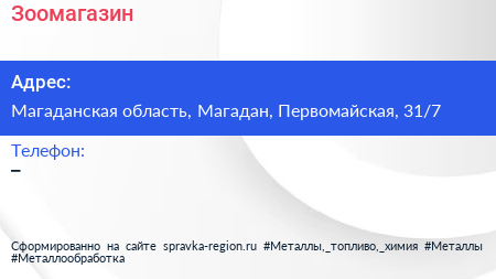 Зоомагазин по адресу Магаданская область, Магадан, Первомайская, 31/7 в дальнейшем Организация, размещена в следующих категориях: