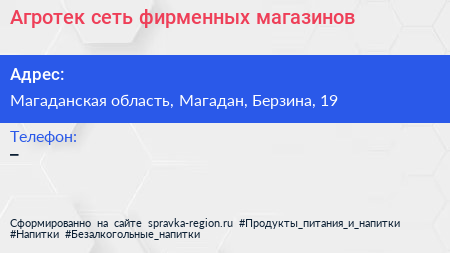 Агротек, сеть фирменных магазинов по адресу Магаданская область, Магадан, Берзина, 19 в дальнейшем Организация, размещена в следующих категориях: