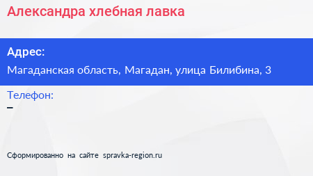 Александра, хлебная лавка по адресу Магаданская область, Магадан, улица Билибина, 3 в дальнейшем Организация, размещена в следующих категориях: