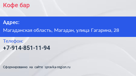 Кофе-бар по адресу Магаданская область, Магадан, улица Гагарина, 28 в дальнейшем Организация, размещена в следующих категориях: