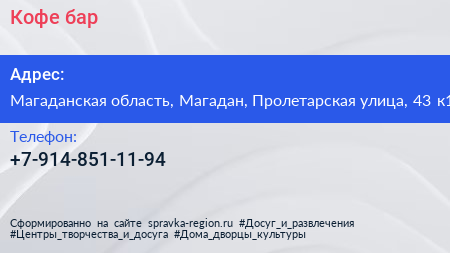 Кофе-бар по адресу Магаданская область, Магадан, Пролетарская улица, 43 к1 в дальнейшем Организация, размещена в следующих категориях:
