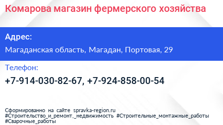Комарова, магазин фермерского хозяйства по адресу Магаданская область, Магадан, Портовая, 29 в дальнейшем Организация, размещена в следующих категориях: