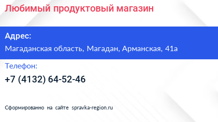 Любимый, продуктовый магазин по адресу Магаданская область, Магадан, Арманская, 41а в дальнейшем Организация, размещена в следующих категориях: