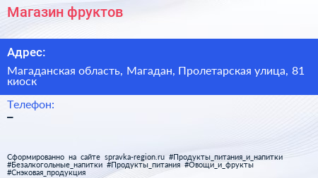 Магазин фруктов по адресу Магаданская область, Магадан, Пролетарская улица, 81 киоск в дальнейшем Организация, размещена в следующих категориях: