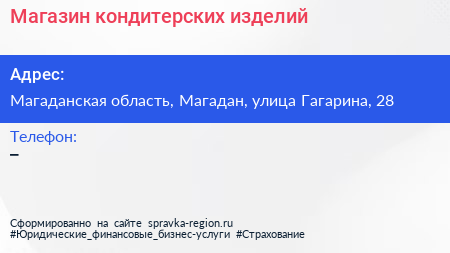 Магазин кондитерских изделий по адресу Магаданская область, Магадан, улица Гагарина, 28 в дальнейшем Организация, размещена в следующих категориях: