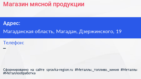 Магазин мясной продукции по адресу Магаданская область, Магадан, Дзержинского, 19 в дальнейшем Организация, размещена в следующих категориях: