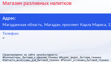 Магазин разливных напитков по адресу Магаданская область, Магадан, проспект Карла Маркса, 12 в дальнейшем Организация, размещена в следующих категориях: