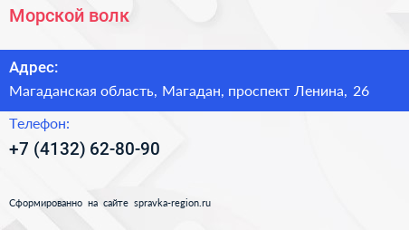 Морской волк по адресу Магаданская область, Магадан, проспект Ленина, 26 в дальнейшем Организация, размещена в следующих категориях: